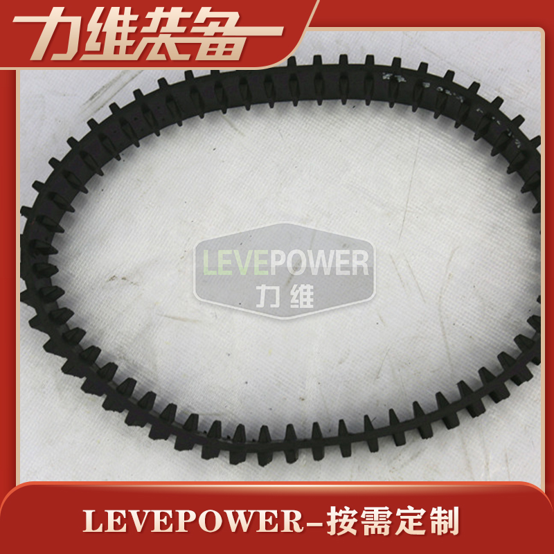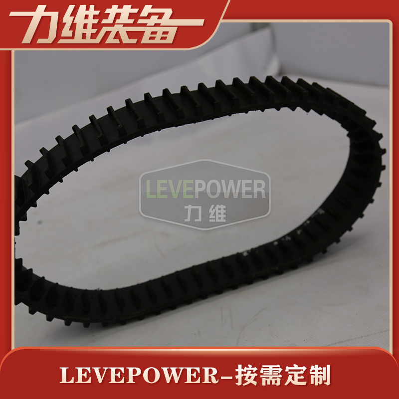 此履帶為撥齒履帶,外花紋采用橫紋細齒緊密結構,內齒密集居中橫紋細齒設計,輕巧耐磨,是一款可配套于機器人底盤上的特種橡膠履帶。