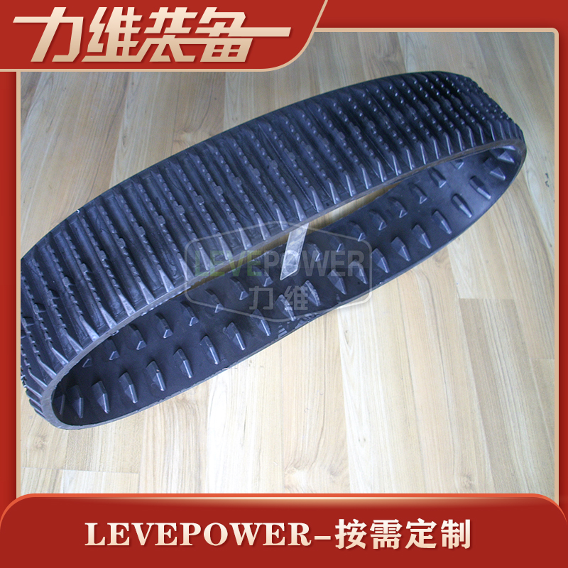此款特種橡膠履帶外花紋采用緊密細矮外花紋設計,此設計會讓底盤系統裝上此履帶行走起來非常平穩,不顛簸。內齒設計為貼邊兩側大梯形內齒,驅動輪較厚,轉彎不易脫帶。