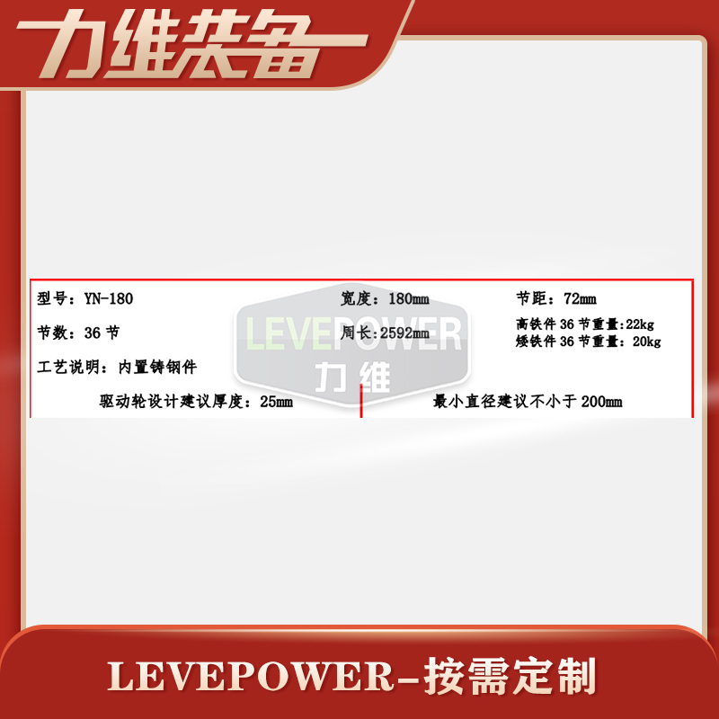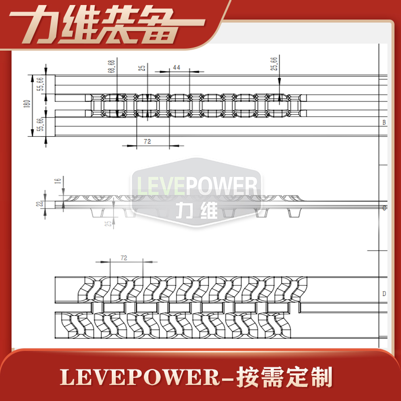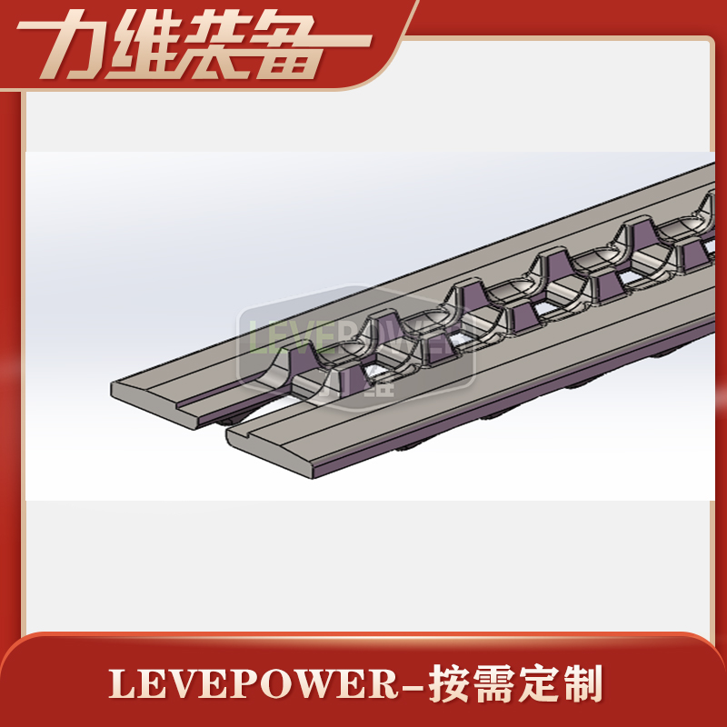 履帶內齒采用高齒梯形設計,內置鑄鋼件,外花紋采用塊狀對稱花紋,此設計大大提高了此款履帶的抓地力,轉彎的時候大大減小了脫帶機率。此款特種橡膠履帶帶體較厚,載重力較強。