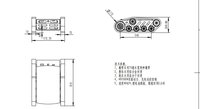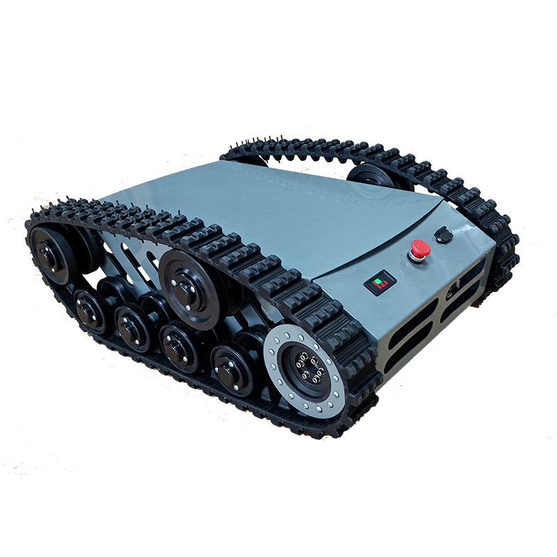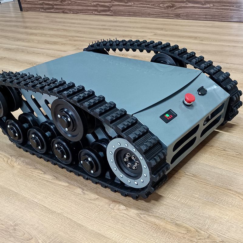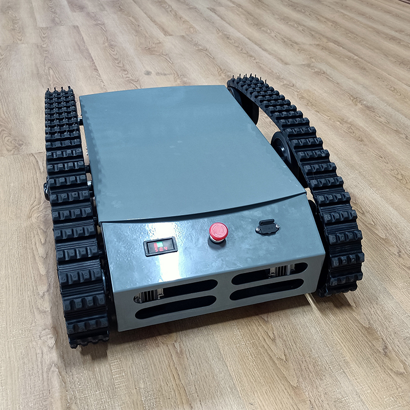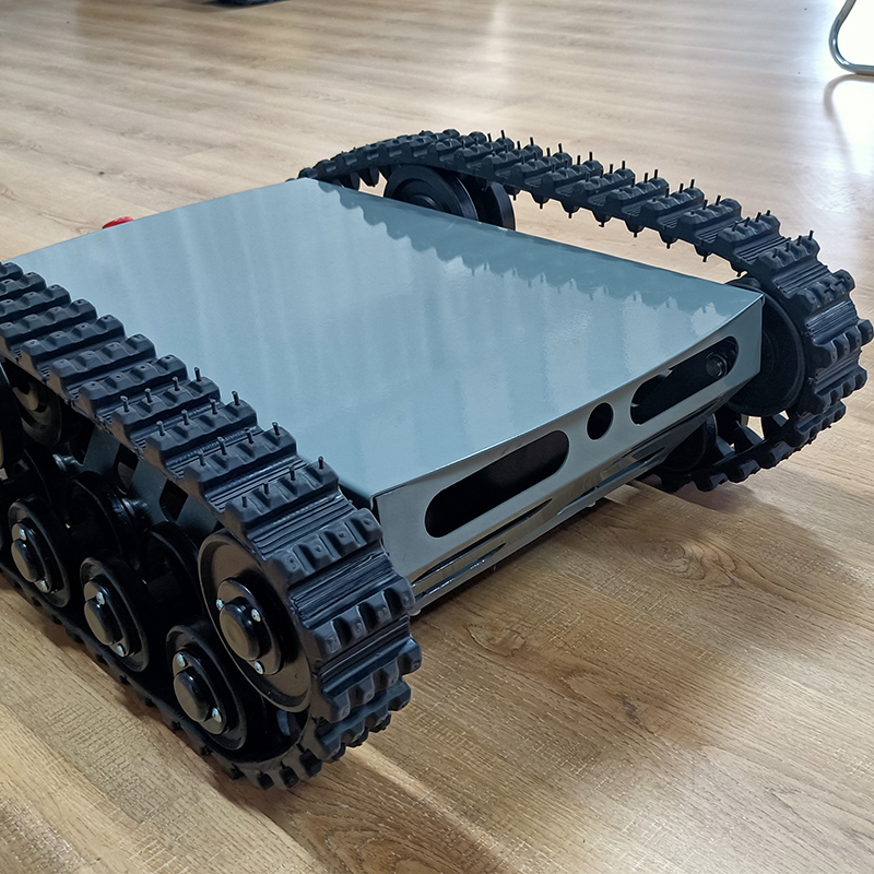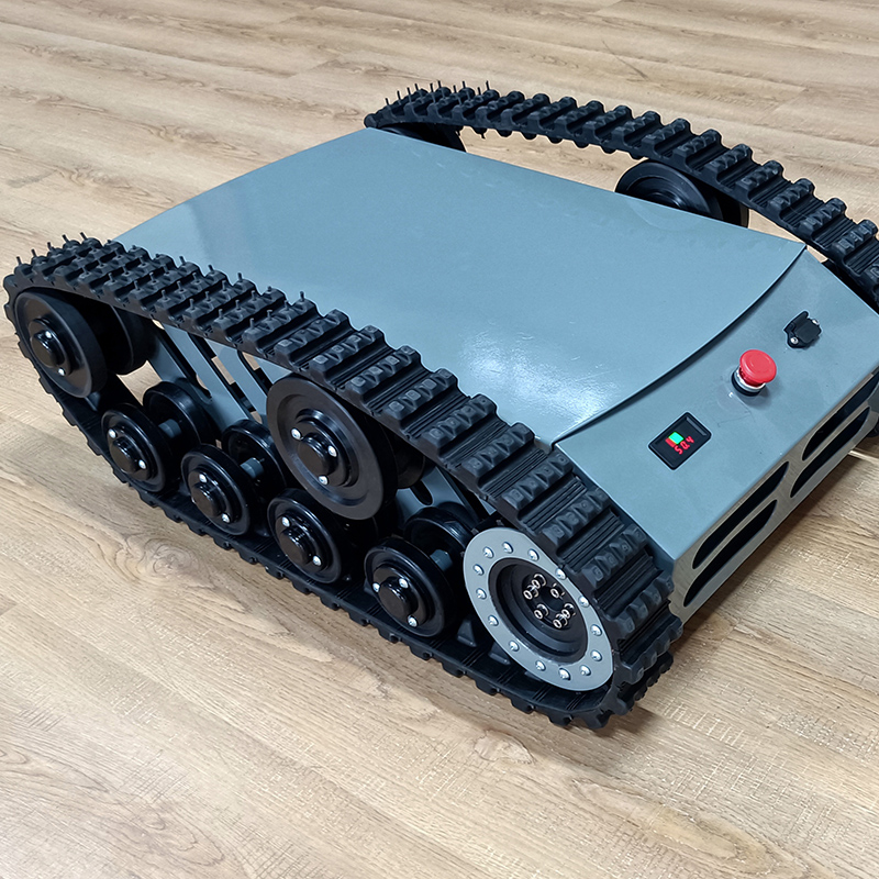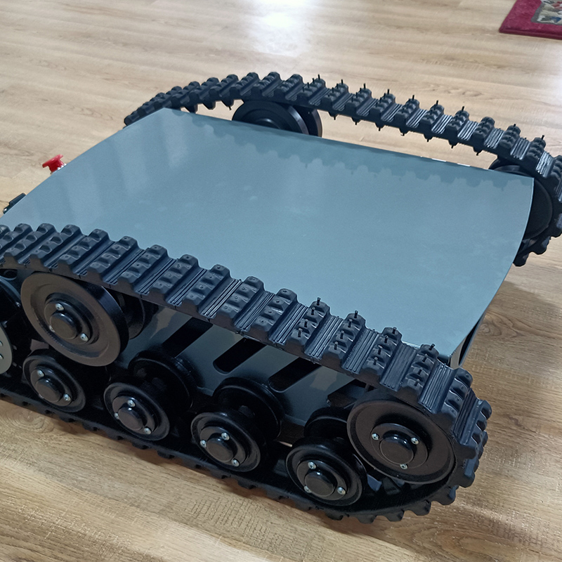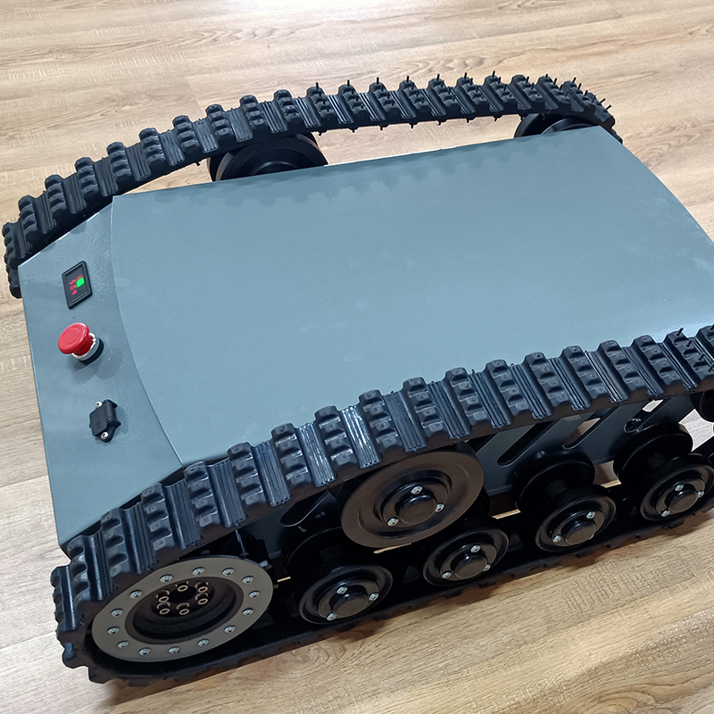 履帶底盤長820mm,履帶底盤寬575mm,履帶底盤高270mm,無線遙控履帶底盤箱體采用鋁合金材質焊接而成,防腐性能好。履帶底盤動力采用48V500W直流無刷電機,渦輪蝸桿減速機動力更強,轉彎靈活。履帶底盤電池采用48V20AH鋰電池,續航時間更長,是一款不錯的機器人橡膠履帶。