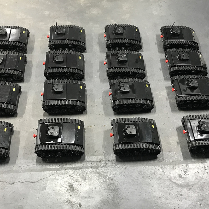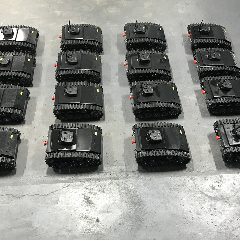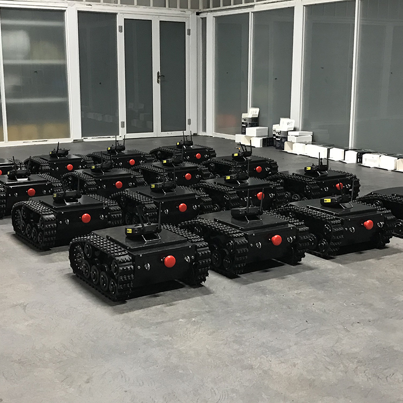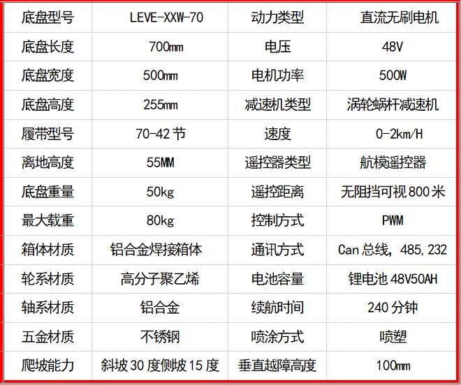 履帶底盤長700mm,履帶底盤寬500mm,履帶底盤高255mm,無線遙控履帶底盤箱體采用鋁合金材質(zhì)焊接而成,防腐性能好。履帶底盤動力采用48V500W直流無刷電機(jī),渦輪蝸桿減速機(jī)動力更強(qiáng),轉(zhuǎn)彎靈活,爬坡性能穩(wěn)定。履帶底盤電池采用48V50AH鋰電池,續(xù)航時間更長,是一款不錯的機(jī)器人橡膠履帶。